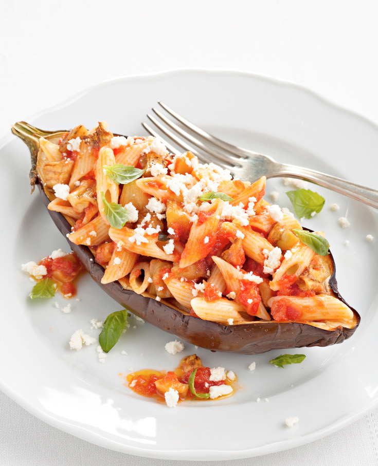 4. Cuoci la pasta in acqua bollente salata per il tempo indicato sulla confezione. Scolala e trasferiscila nella padella con il sugo, sotto la quale avrai riacceso il fuoco. Unisci le melanzane fritte e il basilico e mescola. Suddividi la pasta nei gusci di melanzana, spolverizza con la ricotta grattugiata e servi.