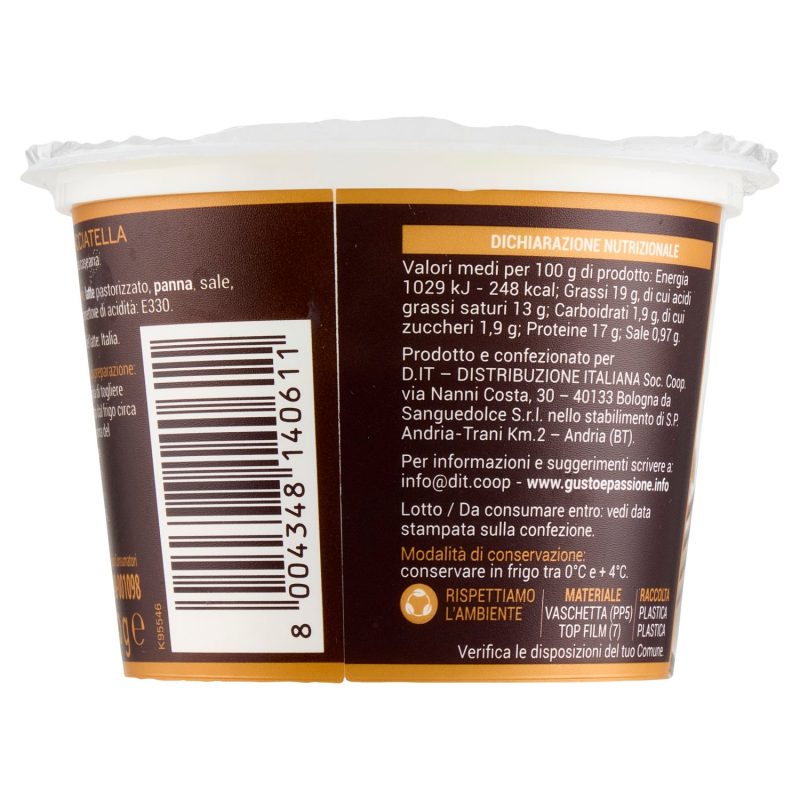 140 g 8004348140611La Stracciatella Pugliese Gusto&Passione è un formaggio tipico costituito da straccetti di mozzarella e panna fresca, realizzato secondo la sapiente tradizione pugliese.