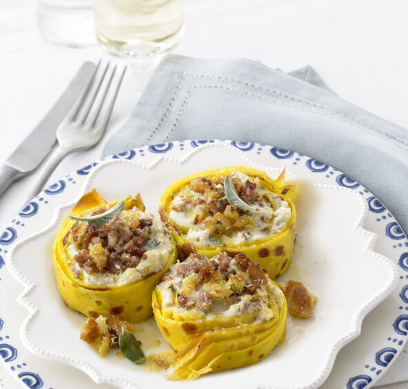 4. Sovrapponete leggermente 2 crêpes, spalmatele con 1/4 del composto di ricotta, arrotolatele e tagliate il cilindro in girelle di 3 cm di spessore. Ripetete l’operazione con il resto delle crêpe e della farcia. Sistemate le girandole su una placca foderata con carta da forno e distribuitevi sopra la salsiccia, il panettone, il burro fuso e il parmigiano rimasti. Cuocete in forno a 180° per 20 minuti.